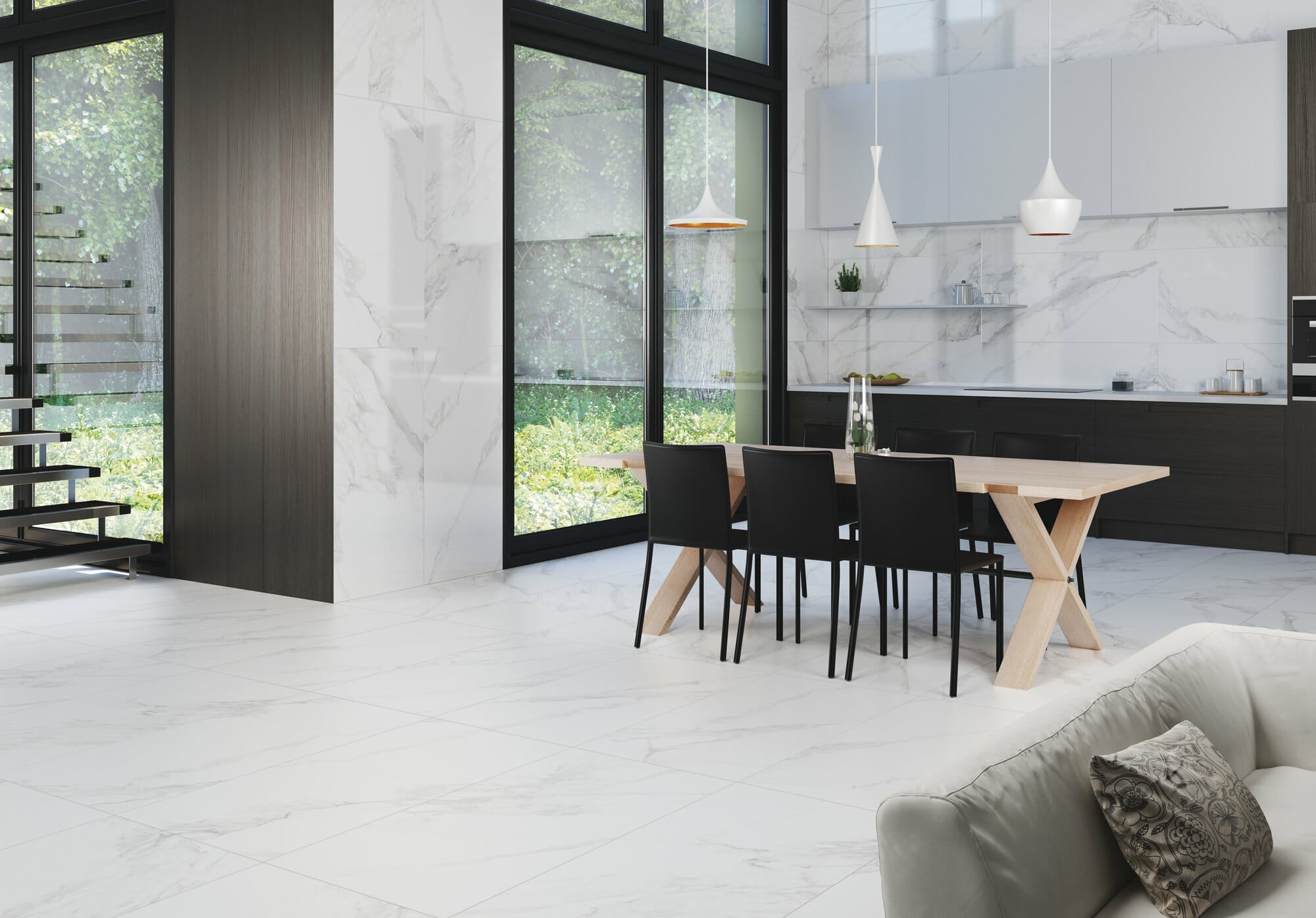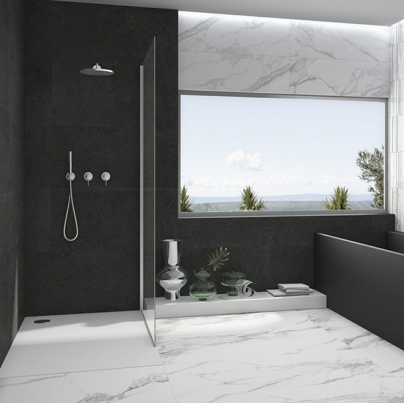 A striking marble look porcelain inspired by Italian Calacatta marble. This porcelain tile has a white background with striking veins, and comes in two sizes including a large slab size tile which is great for walls in a shower or as a feature. You can choose from polished or natural finishes and two colours – this Bianco selection has a grey vein and the Oro has a warm gold coloured vein.