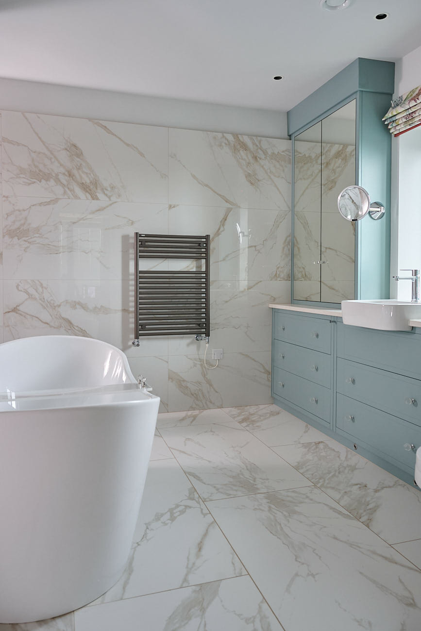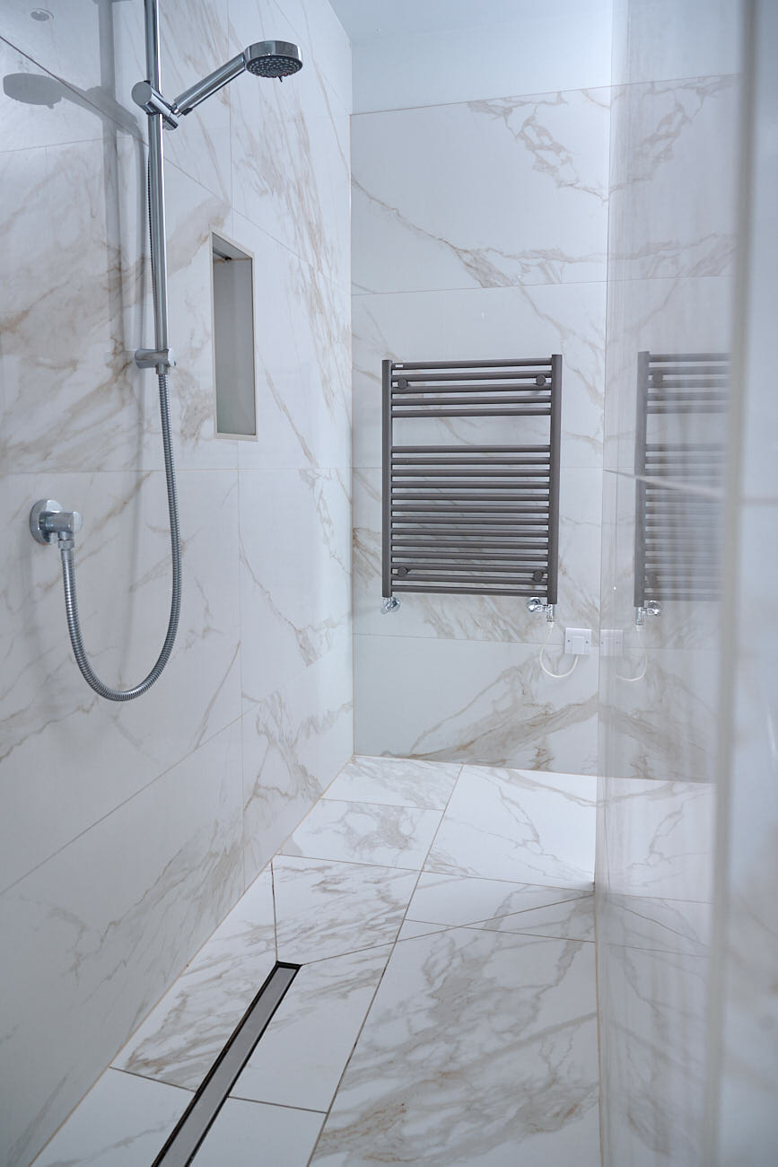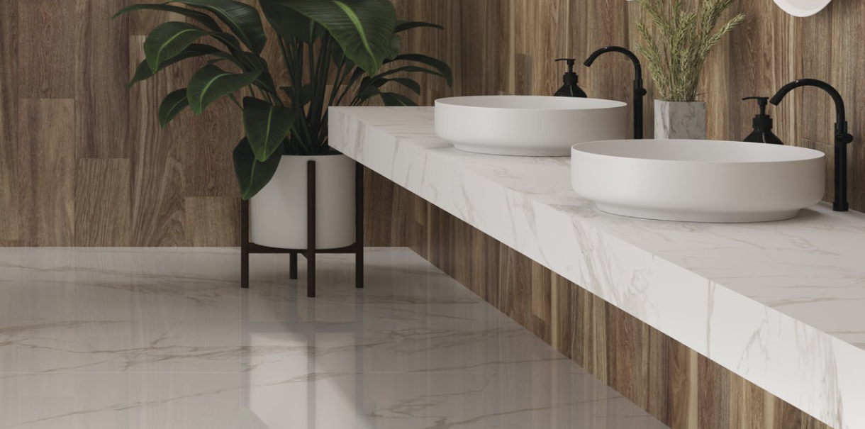 A striking marble look porcelain inspired by Italian Calacatta marble. This porcelain tile has a white background with striking veins, and comes in two sizes including a large slab size tile which is great for walls in a shower or as a feature. You can choose from polished or natural finishes and two colours – this Oro selection has a warm gold vein and the Bianco selection has grey veining.