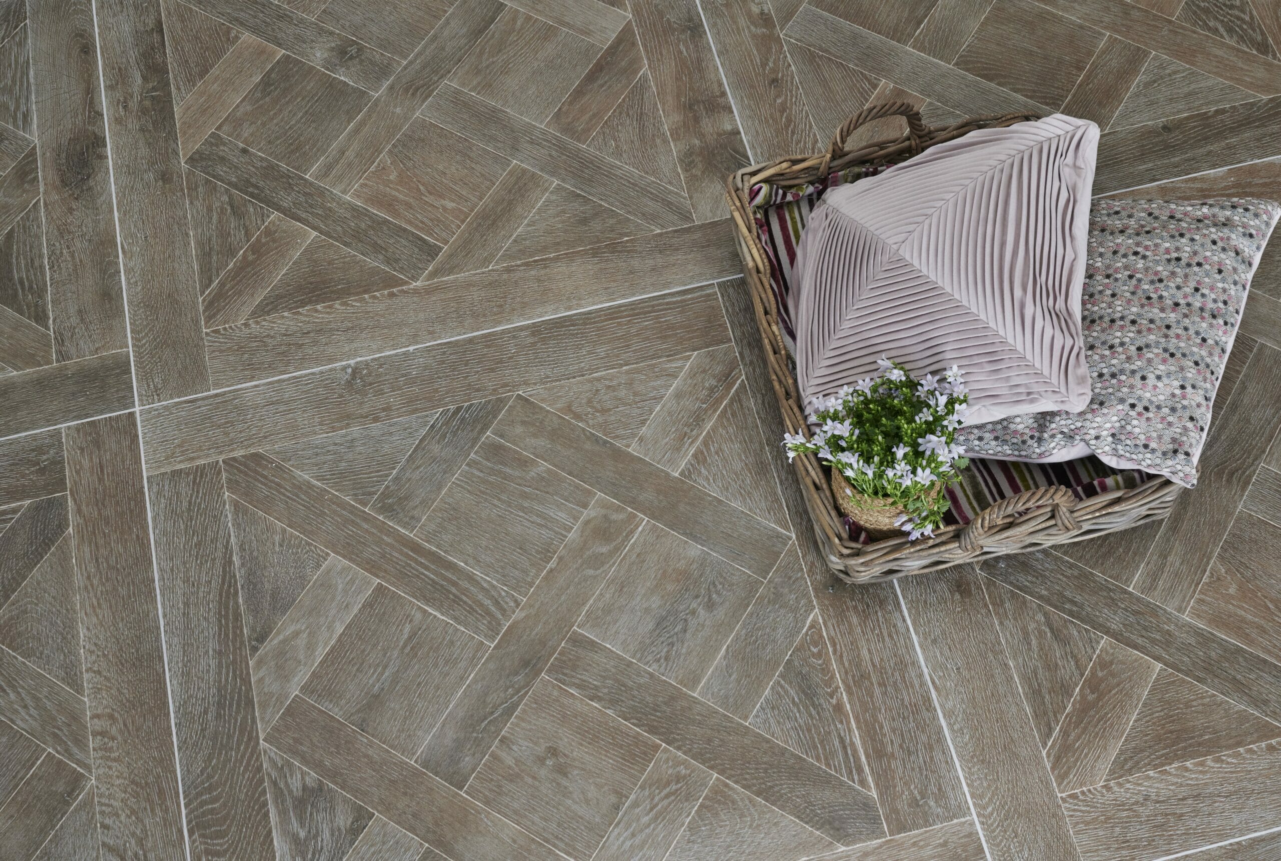 An authentic parquet wood look porcelain tile, replicating an original, characterful floor in four natural warm colours – without the maintenance of a wooden floor. This range is a hard wearing rectified porcelain in a large 900 x 900mm tile.