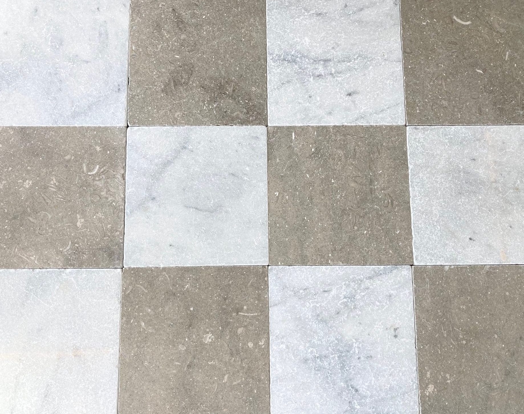 Olivestone Tumbled Limestone and Carrara Tumbled Marble Chequer