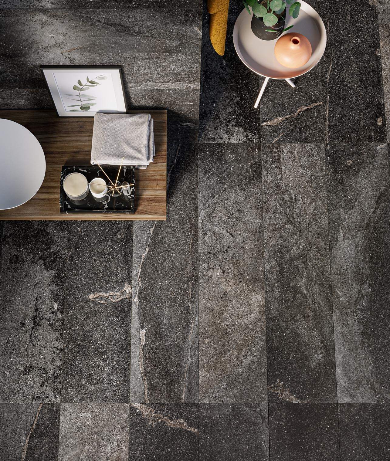 The range is inspired by a special Italian form of asphalt rock known for its unique colouring, its fossils and veining. Available in 4 colour options and a matt or an aged finish. The aged finish has a slight sheen giving the feel of an ancient floor that has been walked on for centuries.