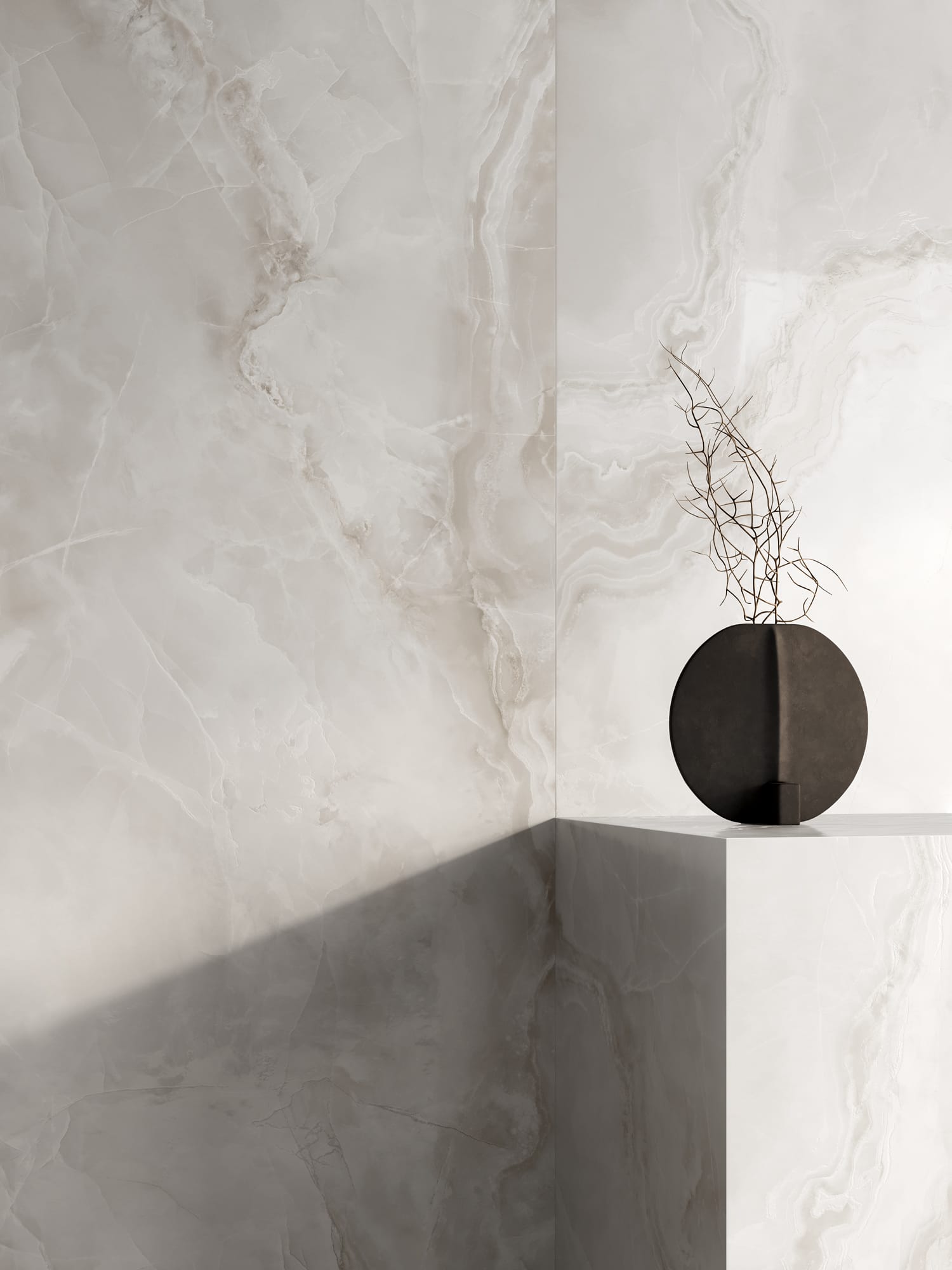 This collection mimics a rare variety of authentic Onyx gemstones, with their intriguing translucent quality and sways of soft tones. Made using innovative state-of-the-art digital technology, this Onyx effect porcelain tile reaches new levels of realism. The 3D honed finish, creates a satin matt look making it hard to tell apart from the real gemstone.