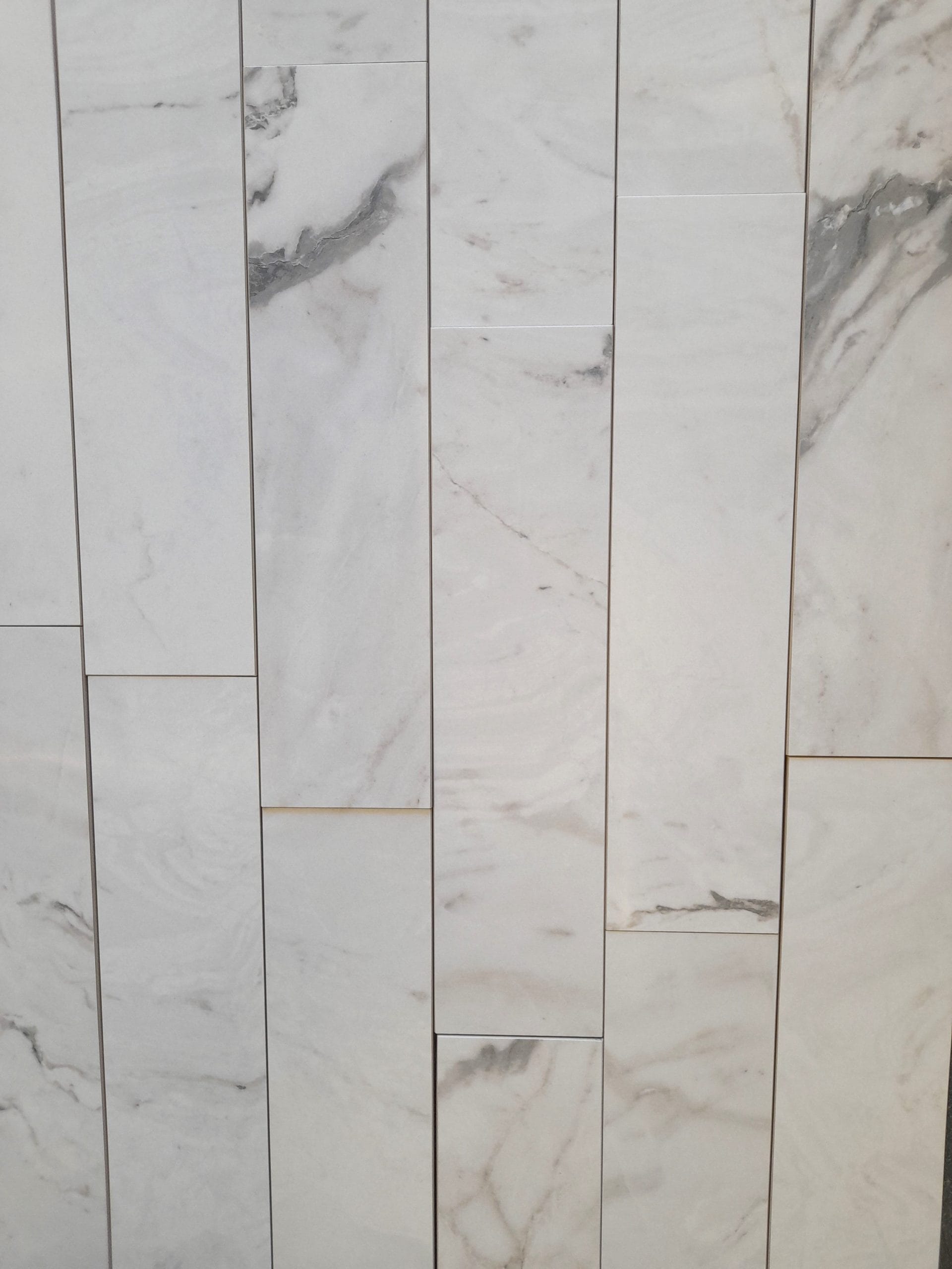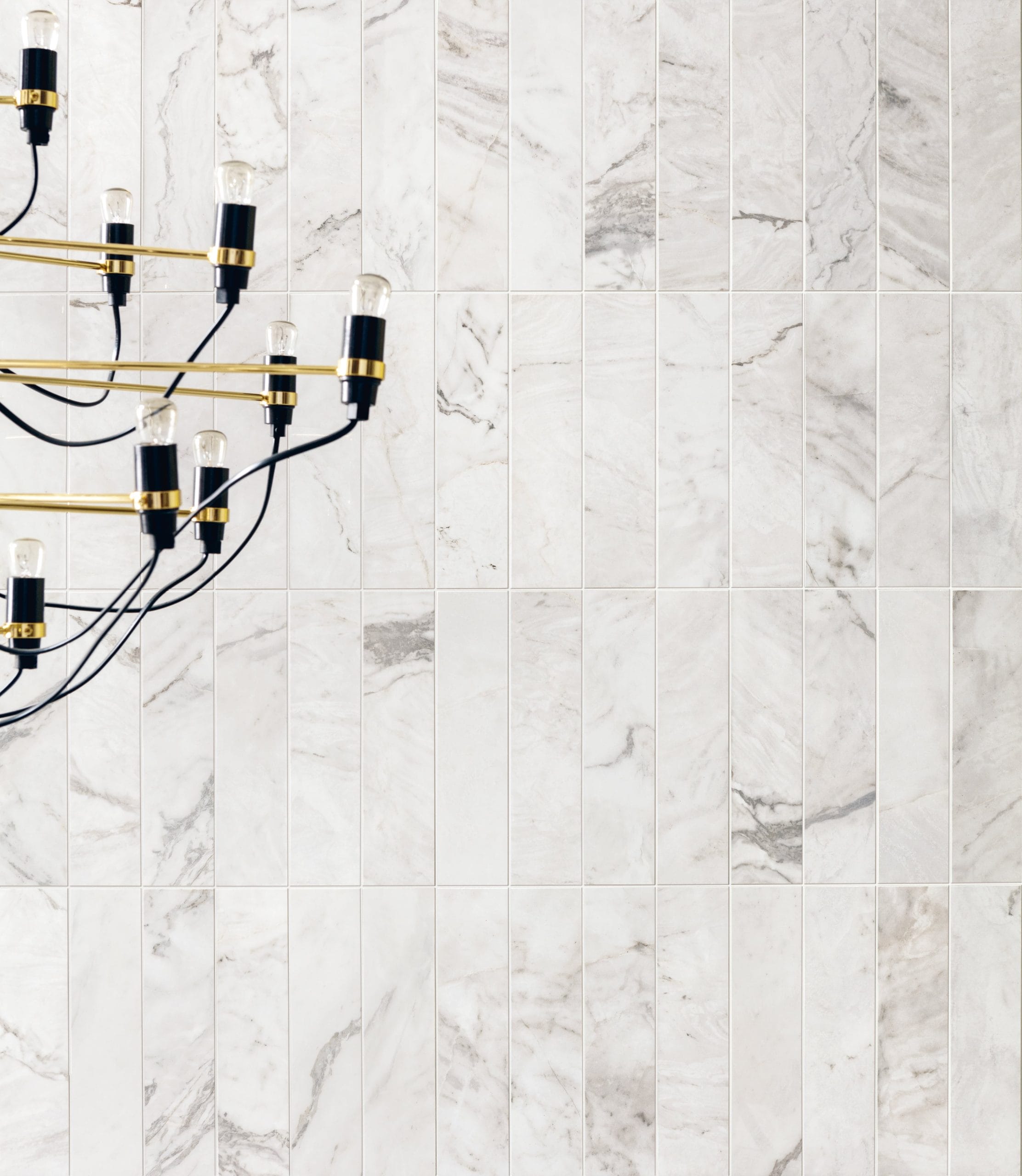 A striking marble look porcelain which replicates the stunning and sought after veining found in real Italian marble. This porcelain tile has a pale background with striking veins and is available in a 300 x 75mm brick size, perfect for creating a herringbone pattern.