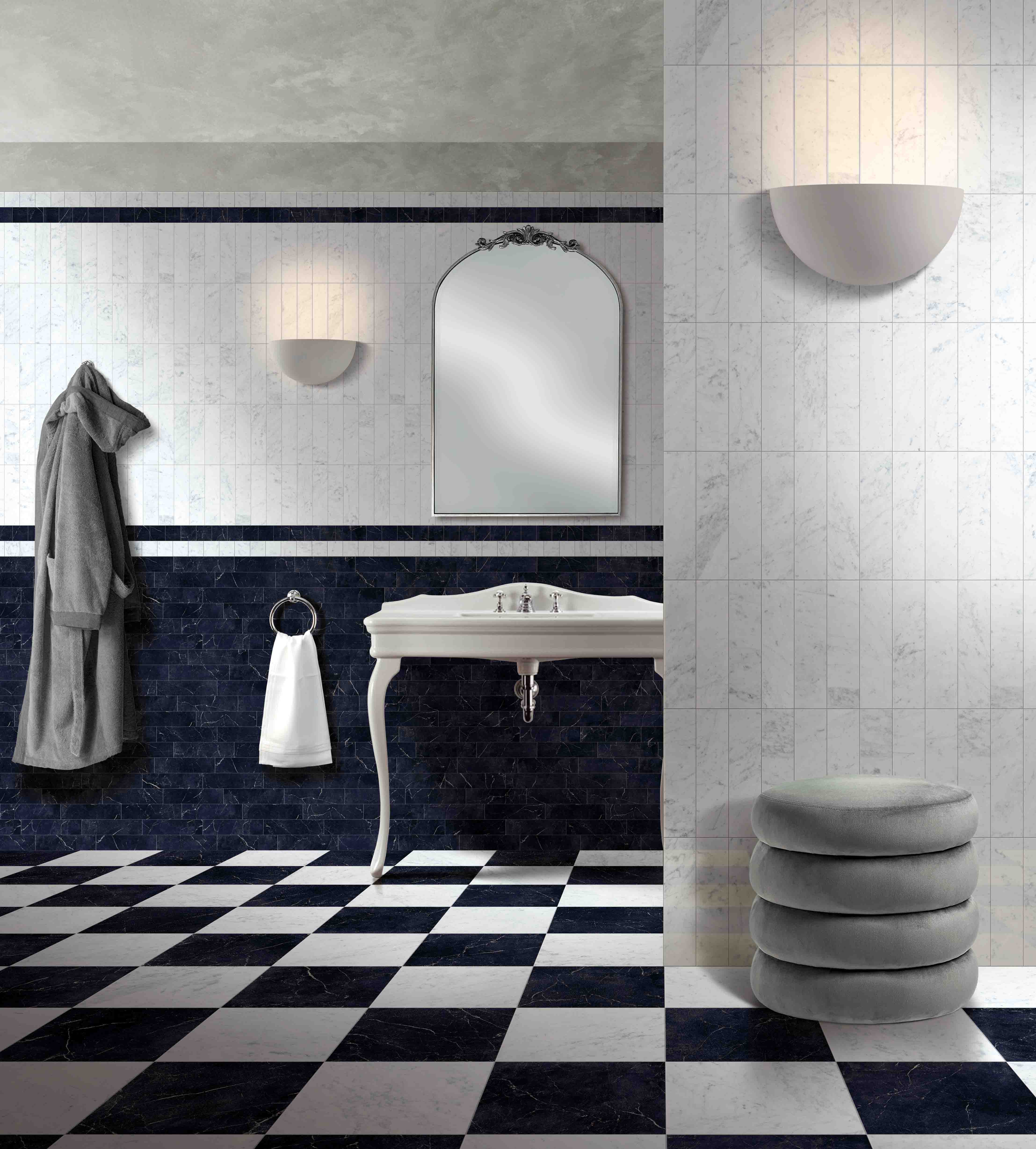 Combining our Parisian Carrara and Nero porcelain tiles to create a traditional and timeless chequerboard look. These porcelain tiles are inspired by the aesthetics of natural marble, and are skillfully aged to add character. Featuring a matt surface with a realistic surface texture.
